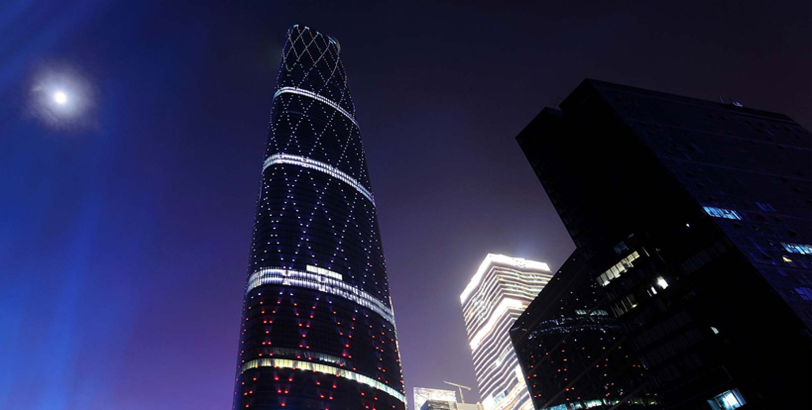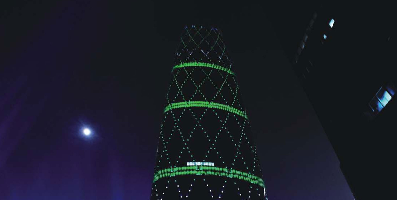 广州西塔最为独特和最强有力的元素,就是建筑本身的网状斜支撑结构,因此照明设计理念将其这一特点发挥的淋漓尽致,利用点状灯外照方式,在夜晚成就点状交叉网的照明效果。伴随多彩灯光至下而上渐变的广度,使顶楼消失于夜空,凸现楼体美的神韵,并强调了建筑广州第一高塔的身份和地位。既满足西塔广州国际金融中心的使用需求,又体现了信息化时代商业特征。